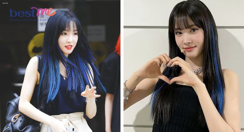 Tóc đen móc lai hai bên mái là một kiểu tóc phổ biến và thời trang, với những sợi tóc được nhuộm màu đen tự nhiên kết hợp với những sợi tóc xanh dương ở hai bên mái.
